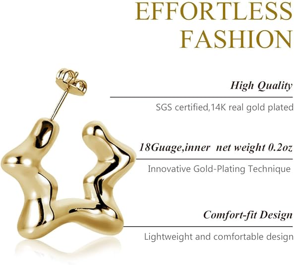 14K Gold Earrings for Girls, Thick Chunky Gold Hoop Earrings, Lightweight Hoop Earrings, Square Hoop Earrings, Golden Hoops, Gold Plated Hoops, Trendy Gold Jewelry, Star Jewelry
